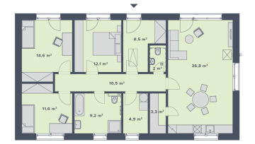 Vstupte do světa komfortního bydlení domu Family L. Hned za velkorysým zádveřím vás uvítá chytrě navržená chodba, která elegantně propojuje všechny místnosti domu. Srdcem domova je impozantní obývací pokoj s kuchyňským koutem, jehož francouzská okna vás lákají na slunnou zahradu.